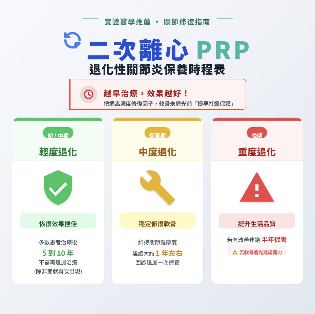 【專業觀點】:PRP 治療的概念有點像幫膝蓋「打蠟」 。車子打蠟後多了一層保護,較不會直接磨損車體;PRP 就好比在您的關節表面加了一層保護,促進新的軟骨生成,減少繼續惡化的機會 。及早治療還是很重要,就像車漆在還沒被磨壞之前先打蠟保護起來——軟骨還沒磨光之前先治療,效果會最好 。