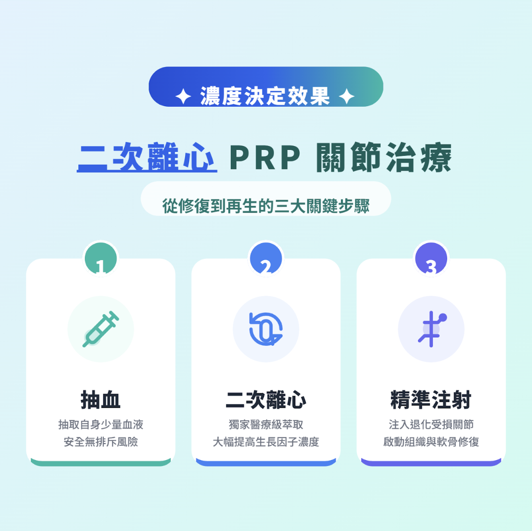 PRP,簡單來說就是利用自己的血液來幫助組織再生修復 。透過抽取一點血液並濃縮血小板後注射回受傷部位,這些富含生長因子的血小板就像身體裡的修復工,能刺激組織再生,促進軟骨修復再生 。